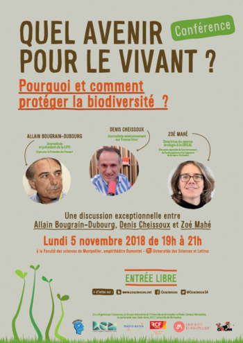 Toutes ces questions et bien d'autres seront discutées dans le cadre d'une conférence exceptionnelle en présence d'Allain Bougrain-Dubourg, journaliste et président de la Ligue pour la Protection des Oiseaux, de Denis Cheissoux, journaliste sur France Inter (Co2 mon amour) et enfin de Zoé Mahé, directrice de l'écologie à la DREAL Occitanie*.