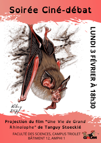 Le Pôle Chiroptérologie du Groupe Naturaliste de l’Université de Montpellier (GNUM) vous propose une soirée ciné-débat autour du film de Tanguy Stoecklé "Une vie de Grand Rhinolophe" , Grand Prix du Festival International du Film Ornithologie de Ménigoute en 2014.