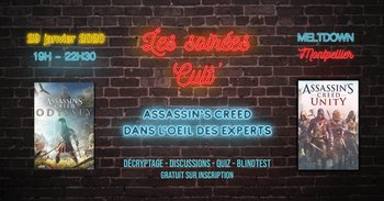Rendez-vous le mercredi 29 janvier 2020 à partir de 19h, au Meltdown Montpellier, pour une Soirée Cult' qui vous plongera dans l’univers de la série de jeux vidéo : Assassin's Creed !