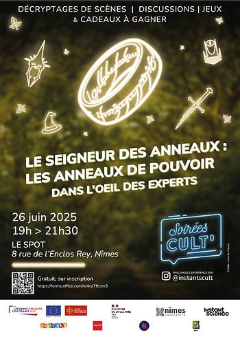 Avis à tous les habitants du Rohan, du Gondor et de la Comté ! Nîmes Université revient au Spot de Nîmes le jeudi 26 juin à 19h, pour une nouvelle Soirée Cult'. Au cœur de ce nouvel événement et dans l'œil de trois chercheurs de Nîmes Université (et non celui de Sauron) : la série déjà culte "Le seigneur des anneaux : Les anneaux de pouvoir".