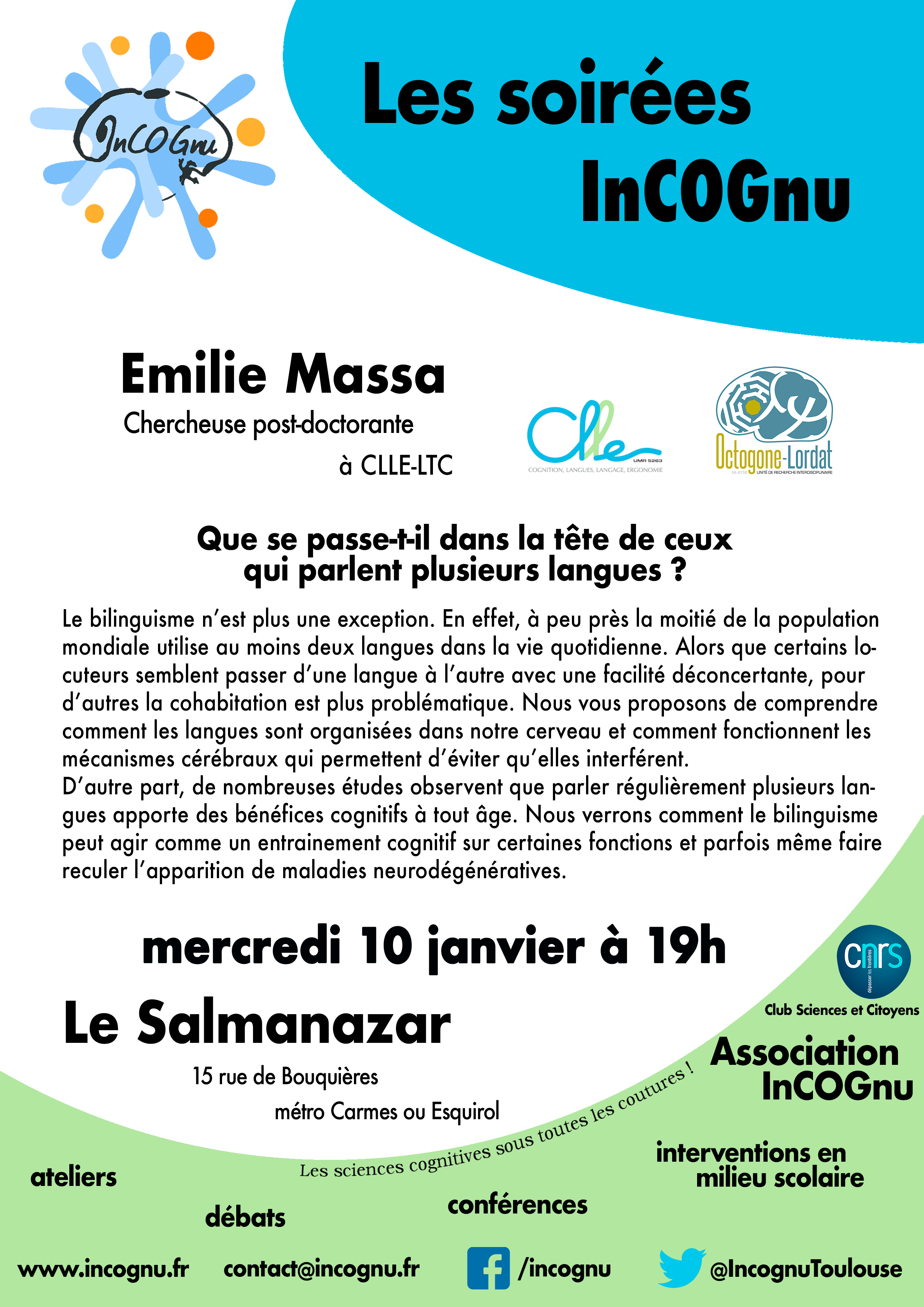 Emilie Massa, chercheuse en neurosciences cognitives, nous expliquera comment nous sommes capables de parler plusieurs langues sans les mélanger et nous parlera des effets bénéfiques du bilinguisme contre le vieillissement de notre cerveau.