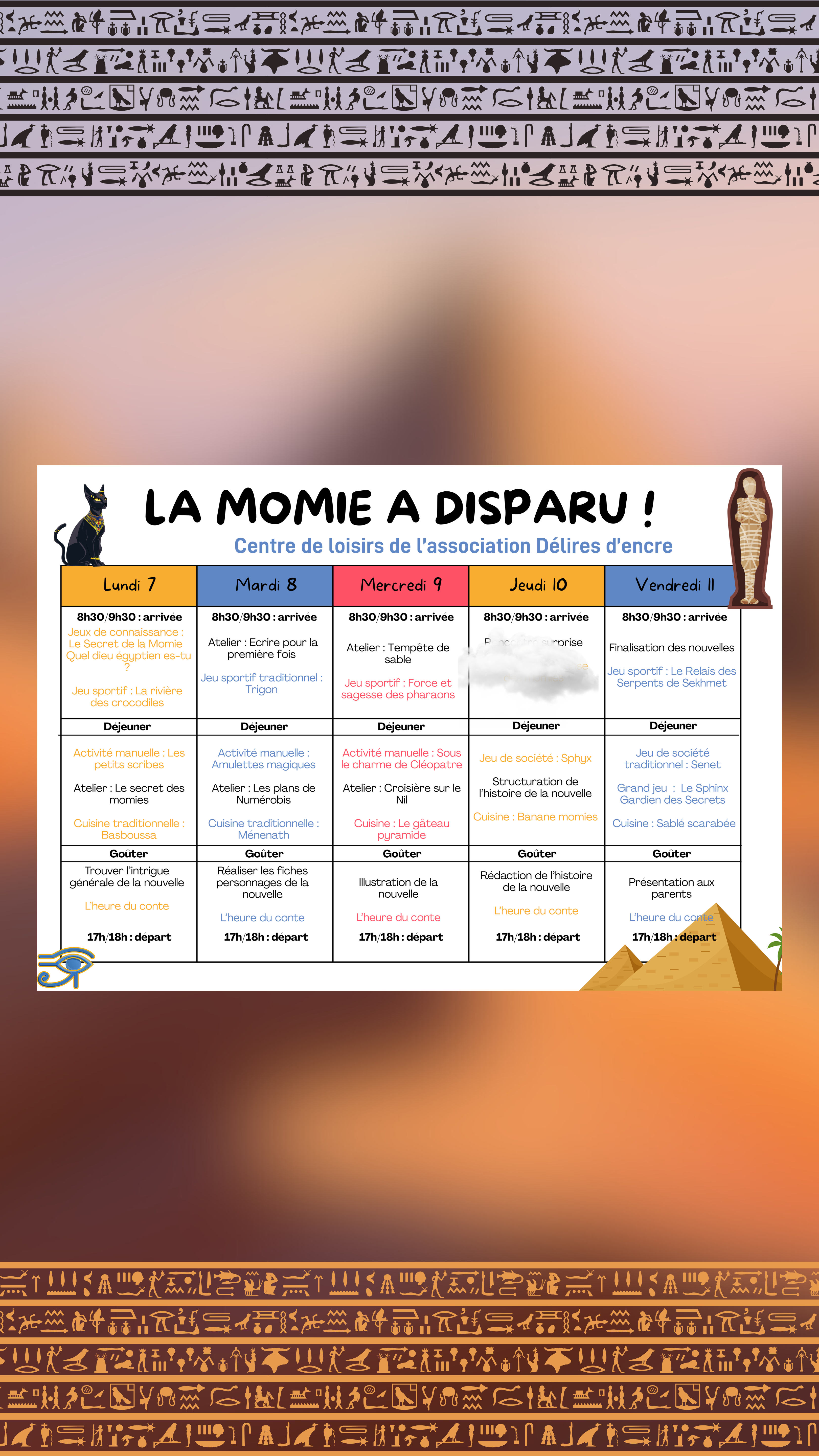Pendant cette semaine immersive, les jeunes participants deviendront de véritables archéologues à la recherche d'une momie. Entre les grains de sables et les pyramides, ils pourront découvrir et explorer l'Égypte Antique.