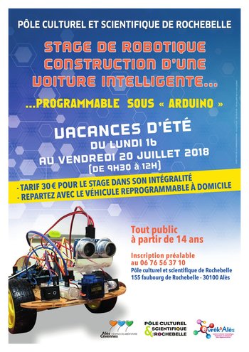 Au cours d’un stage d'une semaine (5 demi-journées consécutives) pendant les vacances scolaires, du 16 au 20 juillet 2018 de 9h30 à 12h, vous construirez une voiture intelligente que vous apprendrez ensuite à programmer sous Arduino!