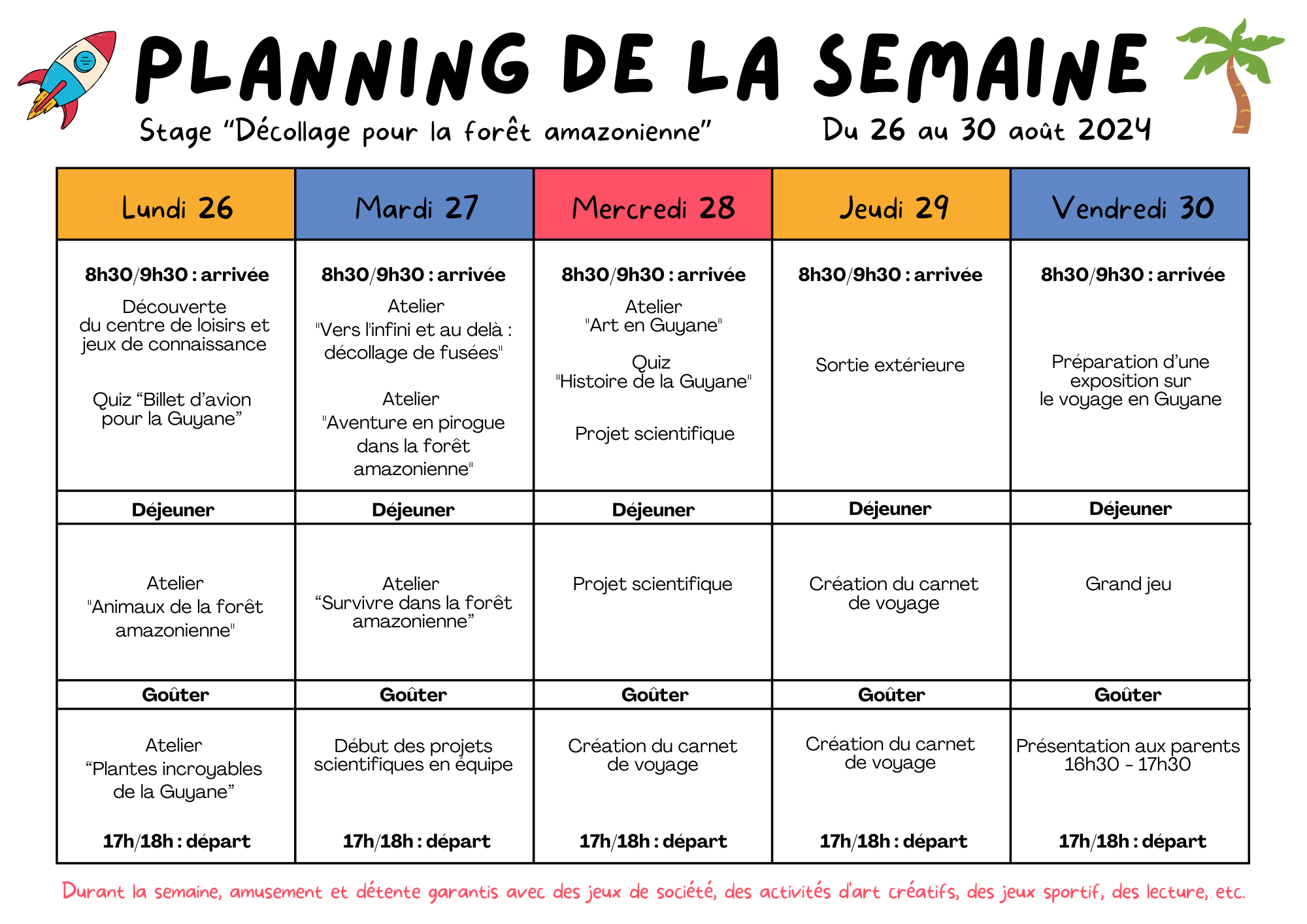 Au fil du voyage, les enfants récolteront toutes les informations que donne la Guyane, du fonctionnement des fusées jusqu’à la faune de la forêt amazonienne. Ils regrouperont ces informations dans leur carnet de voyage qu’ils auront créé durant le stage.