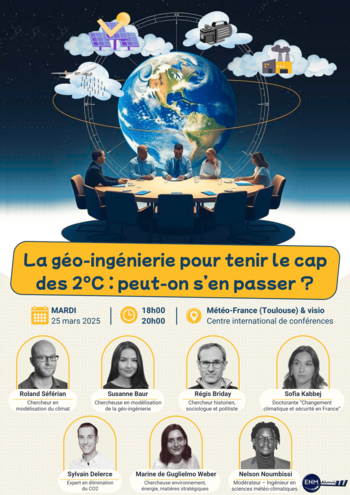 ENM Alumni, l'association des anciens élèves de l'Ecole Nationale de la Météorologie située à Toulouse, organise le mardi 25 mars 2025 de 18h à 20h une table ronde sur le thème de la géo-ingénierie.