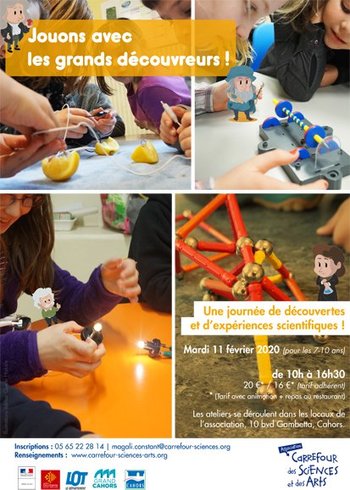 Date et horaires : mardi 11 février 2020 de 10h à 16h30 (pour les 7-10 ans) | Réservation préalable recommandée | Lieu : les ateliers se déroulent dans les locaux de l’association Carrefour des Sciences et des Arts (10 boulevard Gambetta à Cahors).