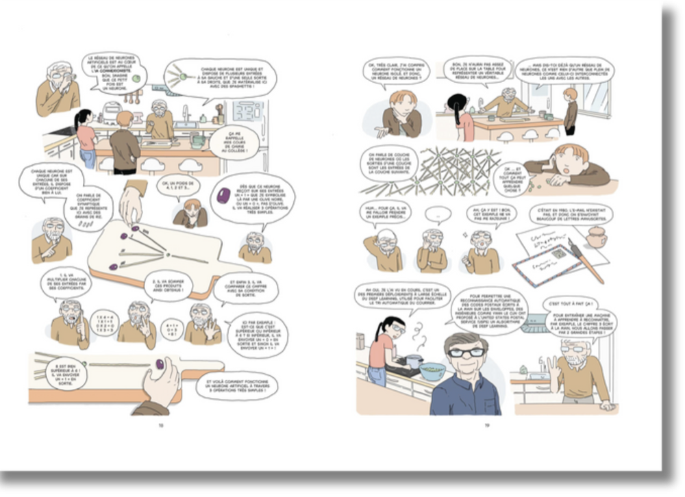 Au fil de leurs échanges, la BD retrace les trois grandes étapes de l’intelligence artificielle, de l’IA déterministe des années 1950 à l’IA connexionniste prédictive, jusqu’à l’IA générative d’aujourd’hui - tout en dévoilant, avec clarté et pédagogie, le fonctionnement des réseaux de neurones qui animent ces technologies.