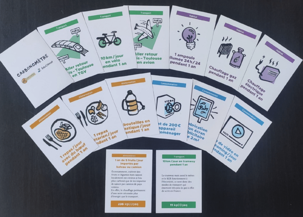 Le Carbonomètre est un jeu de cartes pédagogique qui propose de classer différentes activités selon leurs impacts carbone.