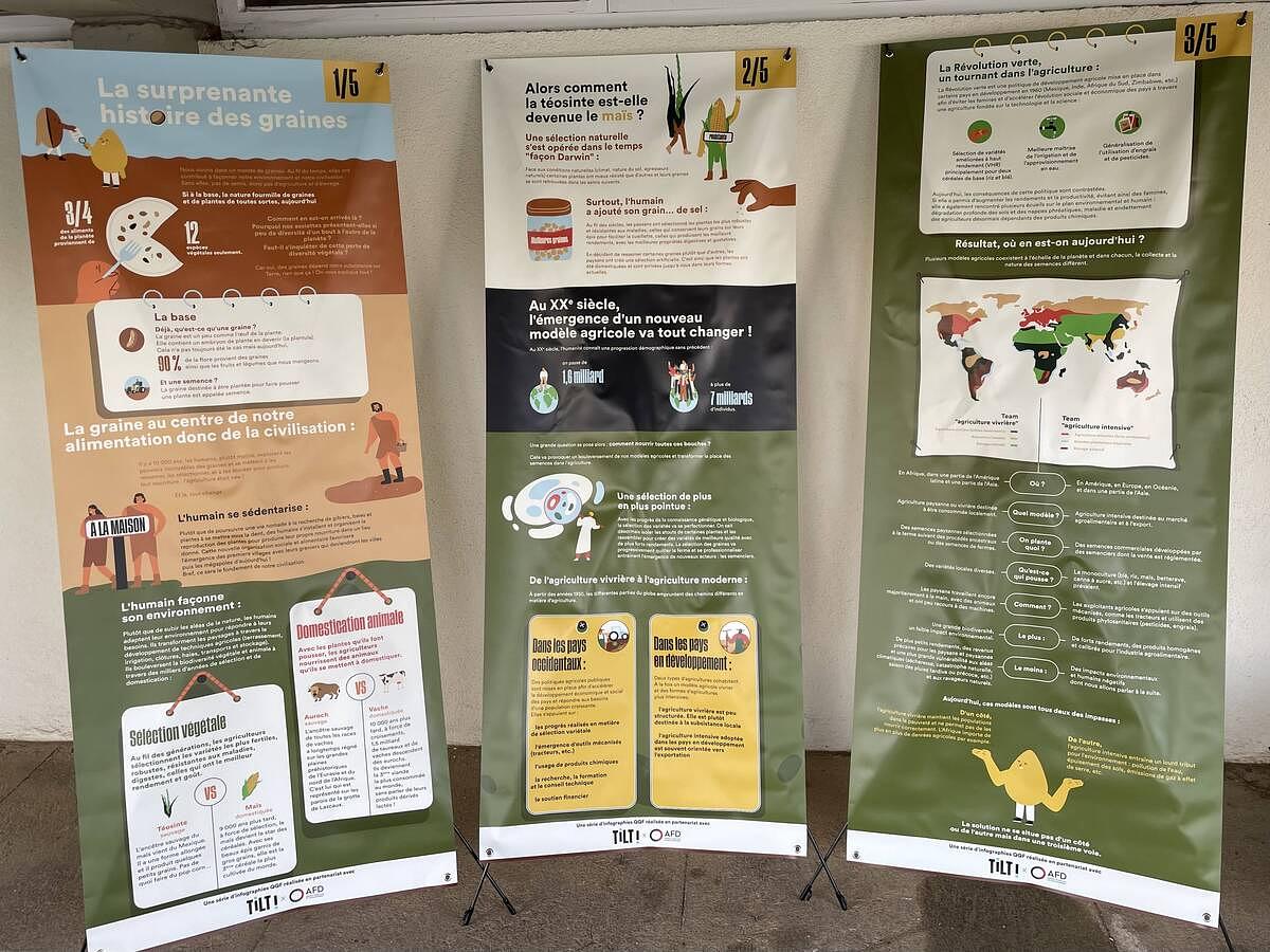 La malle Graines d'Avenir peut être complétée par une exposition mettant en lumière les thématiques autour de l'agriculture moderne (sa place dans le monde occidental et ses conséquences), les enjeux économiques, écologiques et sociétaux liés aux graines et aux semences. Elle a été réalise par Tilt et l'Agence Française du Développement.