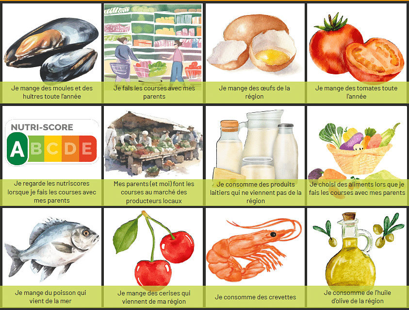 Nous avons développé 3 outils : Le Bingo des pratiques alimentaires, La Rifle des saisons et une Carte du territoire.